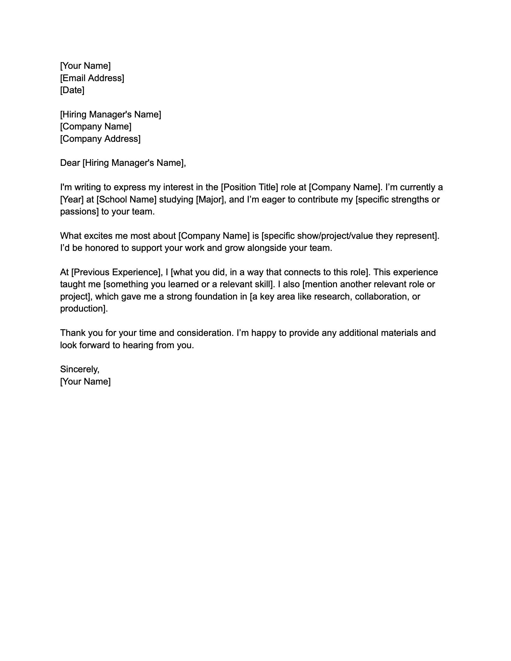 Customize for the role: A cover letter for an editing internship should sound different than one for stage management or casting or development, etc.